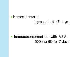 Acyclovir: Side Effects, Dosage, Uses, and More - Healthline Acyclovir is used to treat viral infections. These include herpes zoster ( shingles ), genital herpes, and varicella ( chickenpox). This drug doesn't cure herpes infections. The herpes virus can...