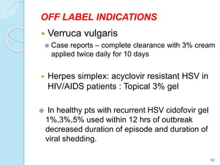 Valacyclovir: approved and off-label uses for the treatment of herpes ... This review focuses on the basic principles, mechanisms of action, safety and approved and off-label usage of valacyclovir in the Immunocompetent and immunocompromised host. Importance of the field: Herpes viruses are associated with a wide spectrum of clinical diseases and impose considerable morbidity and even mortality in immunosuppressed hosts. Although there is no cure for these ... Ganciclovir, Foscarnet, and Cidofovir: Antiviral Drugs Not Just for ... Most commonly these drugs are used in immunocompromised hosts; in children, these uses are most often for off-label indications. All 3 drugs are associated with significant adverse events, and they have potential for long-term toxicity in children. Acyclovir (Systemic) Monograph for Professionals - Drugs.com Uses for Acyclovir (Systemic) Mucocutaneous, Ocular, and Systemic Herpes Simplex Virus (HSV) Infections Treatment of initial and recurrent mucocutaneous HSV-1 and HSV-2 infections (e.g., orofacial, esophageal, genital, nasal, labial) in immunocompromised adults, adolescents, and children, including HIV-infected individuals. Drug of choice. What Does 'Off-Label' Use Mean for Medications? - GoodRx Acyclovir Acyclovir (Zovirax) is an antiviral medication used to treat shingles, genital herpes, and chickenpox. It is sometimes used off-label in combination with a steroid to treat Bell's palsy, and to treat inflammation of the esophagus caused by the herpes simplex virus (HSV). Aimovig