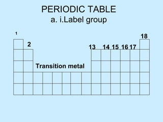 Periodic table with group labels. Periodic Table groups | Chemistry Nexus In the standard form of the periodic table the s-block, p-block, and d-block elements are organised into 18 vertical columns called groups. These are labelled from 1 to 18 under current IUPAC numenclature. Earlier labelling schemes (Trivial Group names) For historical reasons some Groups have special names. Group (periodic table) - Wikipedia General inorganic chemistry texts usually put scandium (Sc), yttrium (Y), lanthanum (La), and actinium (Ac) in group 3, so that Ce-Lu and Th-Lr become the f-block between groups 3 and 4. However, sources that study the matter usually put scandium, yttrium, lutetium (Lu), and lawrencium (Lr) in group 3, as shown here. Periodic Table of Elements - PubChem Such was the case when IUPAC recently reviewed elements 113, 115, 117 and 118, and decided to give them official names and symbols (goodbye, ununseptium and hello, tennessine!). Atomic weights found within a periodic table one might think are constant. The truth is that atomic weights have changed as a function of time. spreadsheetpage.com › study › periodic-tablePrintable Periodic Table » The Spreadsheet Page Today, the periodic table has 118 different elements, and has undergone extensive changes since Mendeleev’s first version. To help organize the elements, the modern periodic table is divided into periods and groups. A period is a horizontal row; there are seven on the periodic table. A group, or family, is a vertical column.
