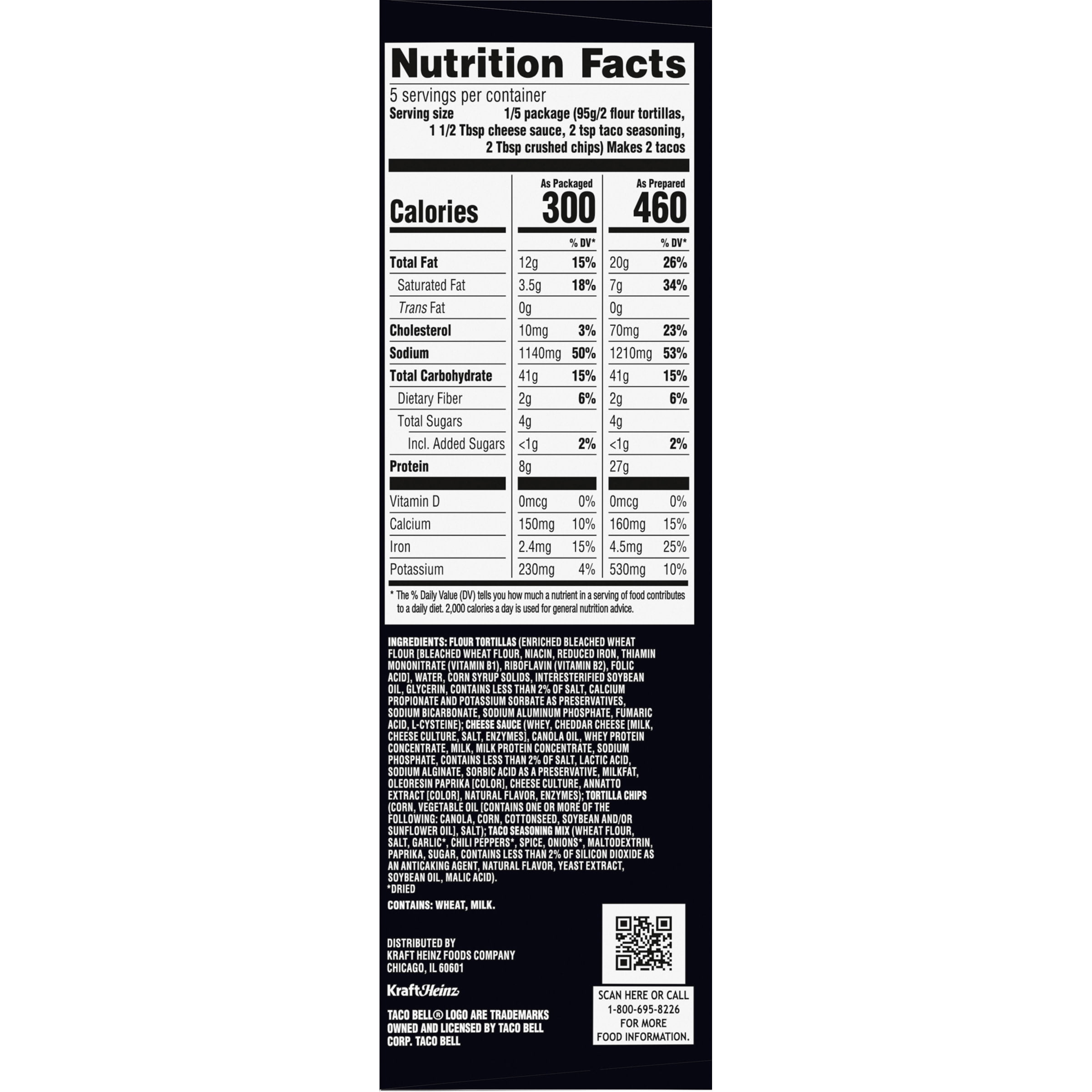 Taco bell nutrition facts. Calories in Taco Bell Bean Burrito and Nutrition Facts 9g. Carbs. 54g. Protein. 13g. There are 350 calories in 1 burrito of Taco Bell Bean Burrito. Calorie breakdown: 23% fat, 62% carbs, 15% protein. Calories in Taco Bell Taco Shells and Nutrition Facts There are 150 calories in 3 shells (32 g) of Taco Bell Taco Shells.: Calorie breakdown: 36% fat, 59% carbs, 5% protein. Taco Bell Nutrition Facts & Calories Updated June 2022 Taco Bell Nutrition Facts & Calories Updated June 2022. Leave a Comment / Nutrition, T / June 23, 2022 June 23, 2022 / 12 minutes of reading. Contents. 1 Taco Bell Nutrition; 2 Taco Bell Calories. 2.1 BURRITOS; 2.2 FREEZES; 2.3 FRESCO MENU; 2.4 LIMITED TIME OFFER; 2.5 POWER MENU; 2.6 SIDES; 2.7 SPECIALTIES; 2.8 DRINKS & SWEETS; Taco Bell Chicken Quesadilla Calories - Fast Food Calories Below are the nutrition facts for a Taco Bell Chicken Quesadilla. Taco Bell Quesadilla Calories and Other Nutrient Values. The following nutritional information is based on a chicken quesadilla with all the primary ingredients. There are 510 calories in a Taco Bell Chicken Quesadilla. Of those 510 calories, 250 are from fat, and about 152 ...