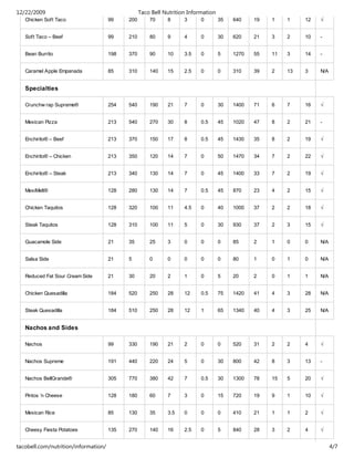 Taco Bell Nutrition FAQ | Taco Bell® And, you don't have to compromise on the flavor and value you love and expect from Taco Bell. For example, nearly 3/4 of our menu items are less than 500 calories. And for breakfast, over 3/4 of our menu is less than 600 calories. Taco Bell Nutrition Online | Food For All Marissa, North America Nutrition Specialist, is the second-ever in-house dietitian at Taco Bell. Over the past four years, she has spearheaded the launch of the Food for All Fam - a network of registered dietitians who help Taco Bell keep our finger on the pulse of issues that are important to our guests, like reducing added sugars and sodium ... Taco Bell Nutrition Information Contact restaurant for prices, hours & participation, which vary. Tax extra. 2,000 calories a day used for general nutrition advice, but calorie needs vary. Additional nutrition information available upon request. Interactive Nutrition Menu - Taco Bell - Canada Taco Bell - Canada. Interactive Nutrition Menu. Interactive Nutrition Menu.