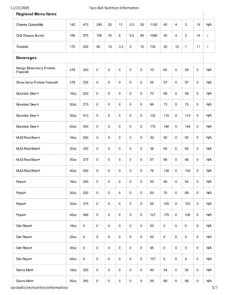 Taco Bell Nutrition Info & Calories Jul 2022 | SecretMenus The Beverages on the Taco Bell menu with the highest amount of calories are Pepsi (30 oz) (380 calories), Lipton Raspberry Iced Tea (30 oz) (300 calories) and Mountain Dew Baja Blast Freeze (20 oz) (290 calories). Beverages With the Highest and Lowest Total Fat on the Taco Bell Menu