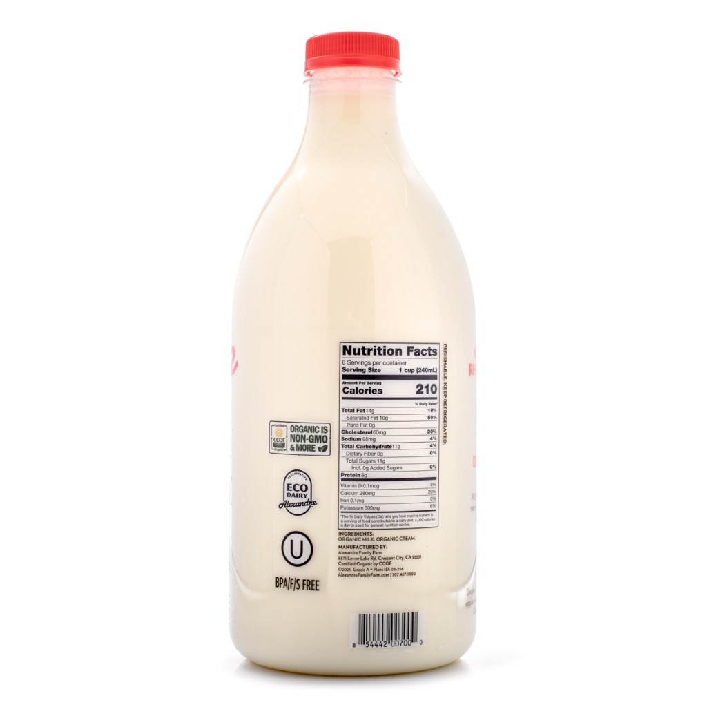 Alexandre Family Farm - Four Star Seafood and Provisions This whole milk from the Alexandre Family Farm has a 6% butterfat which adds a deeper, richer quality to the milk, significantly creamier than regular whole milk. The Alexandre Family really checks all the boxes. They are committed to regenerative farming practices, they are non-GMO certified, 100% organic, and their packaging is 100% BPA-Free.