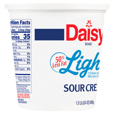 Amazon.com: Daisy, Regular Sour Cream, 8 oz : Home & Kitchen Daisy Sour Cream is always high-quality with no artificial additives or preservatives. ... *Daisy Light SC has 1/3 fewer calories (40 calories is 1/3 less than 60 calories) and 50% Less Fat (2.5g is 50% less than 5g) ... We recommend that you do not solely rely on the information presented and that you always read labels, warnings, and ...