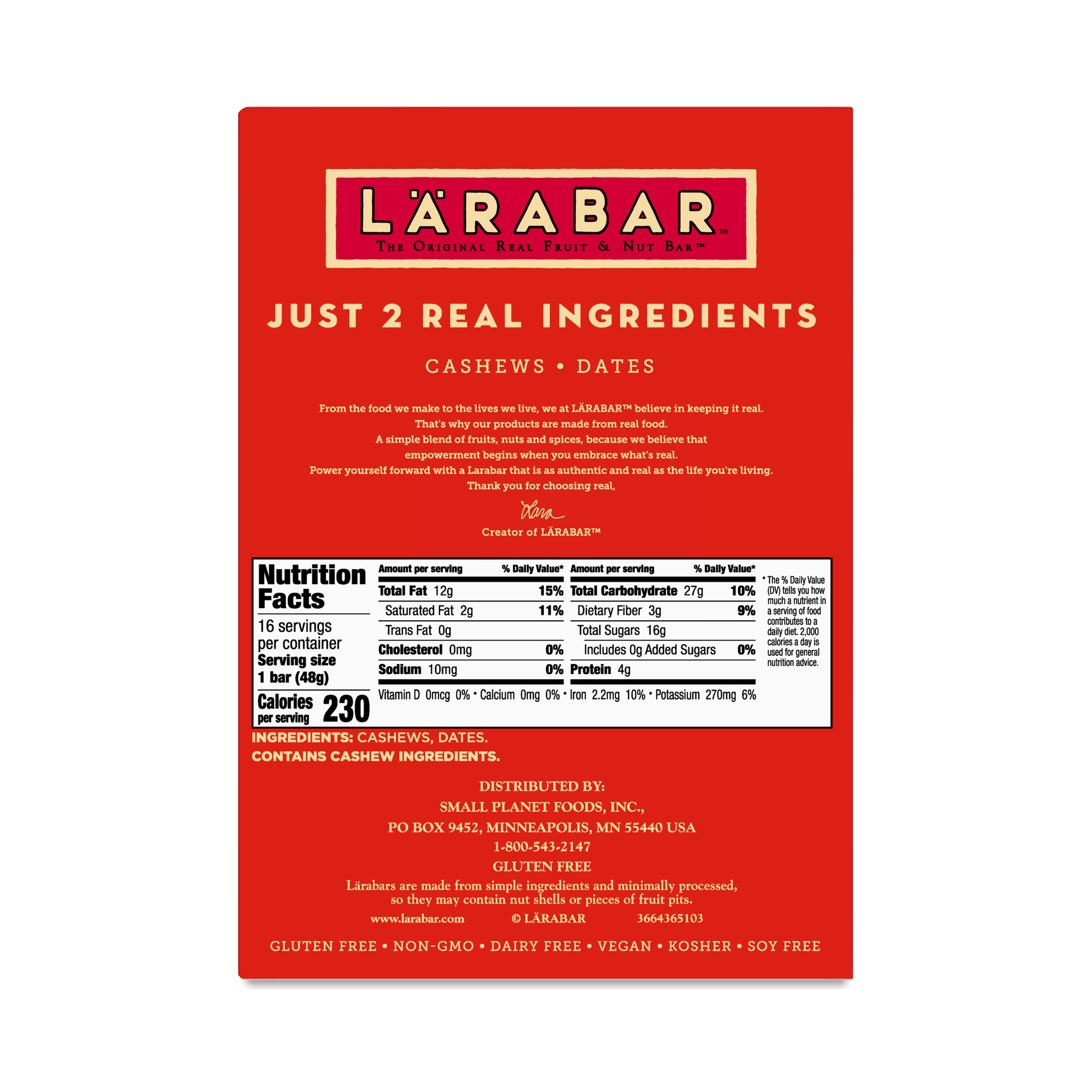 Cashew Cookie "Larabar" Nutrition Facts & Calories - Self Cashew Cookie "Larabar" Serving size: Recipe Ingredients Qty x Measure click on name for nutrient facts Dates, deglet noor 8.0 x 1 ounce (28g) Nuts, cashew nuts, raw 2.4 x 1 ounce (28g) Preparation...