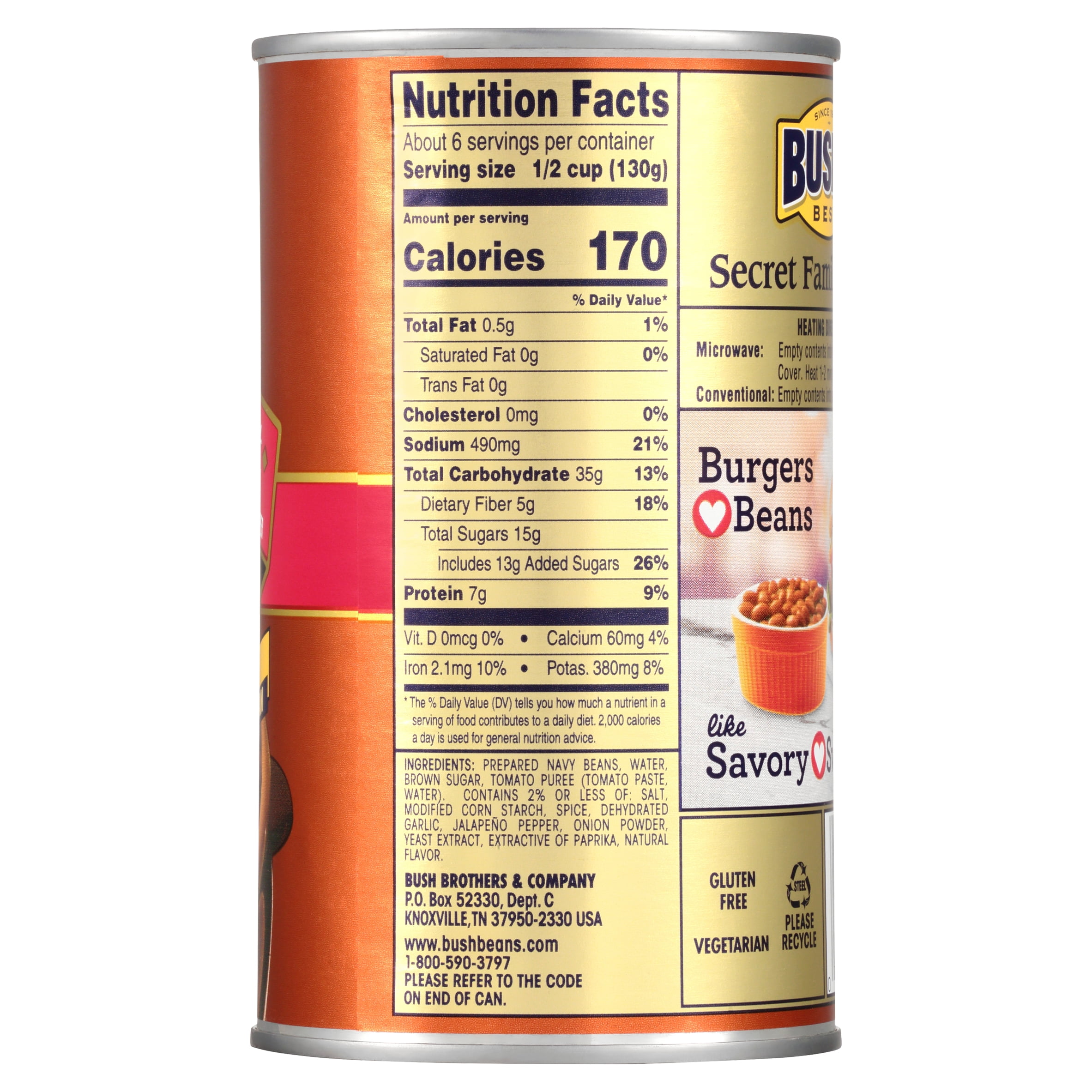 Bush's Baked Beans Nutrition | livestrong Most of the carbs in these products come from the beans themselves. A 1/2 cup of plain navy beans contains 24 g of carbs, while an equal serving of Bush's Baked Beans contains 24 to 33 g of carbs. Beans are also a good source of protein. Just one serving of Bush's Baked Beans contains 6 g of protein.