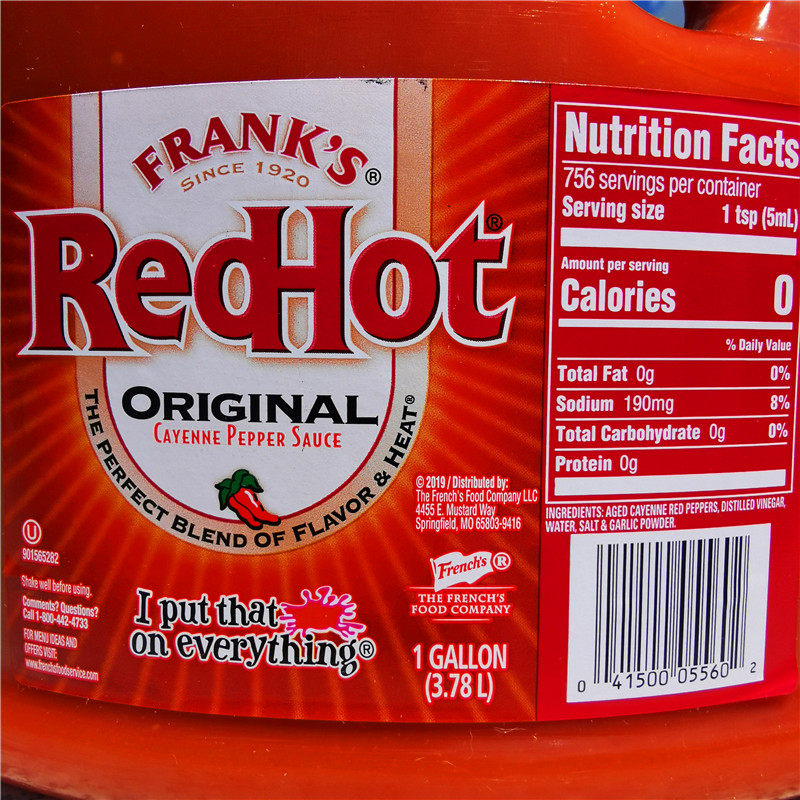 Frank's RedHot Hot Sauce - Original, 32 fl oz - Walmart.com Frank's RedHot Original Cayenne Pepper Hot Sauce is made with a premium blend of aged cayenne peppers to add a kick of heat and whole lot of flavor to your favorite foods. Bring the heat to wings, chicken sandwiches, buffalo chicken dip, eggs -- put that $#!t on everything! Our sauce is essential at tailgates, parties, cookouts, you name it. Frank's RedHot Nutrition: Is Frank's RedHot Healthy? A teaspoon of Frank's RedHot Original Cayenne sauce contains 190 mg of sodium, which is 8 percent of your daily requirement. The sodium content is considerably more than the 35 mg you get from a teaspoon of Tabasco and the 130 mg that you get from that same serving size of Crystal Hot Sauce.