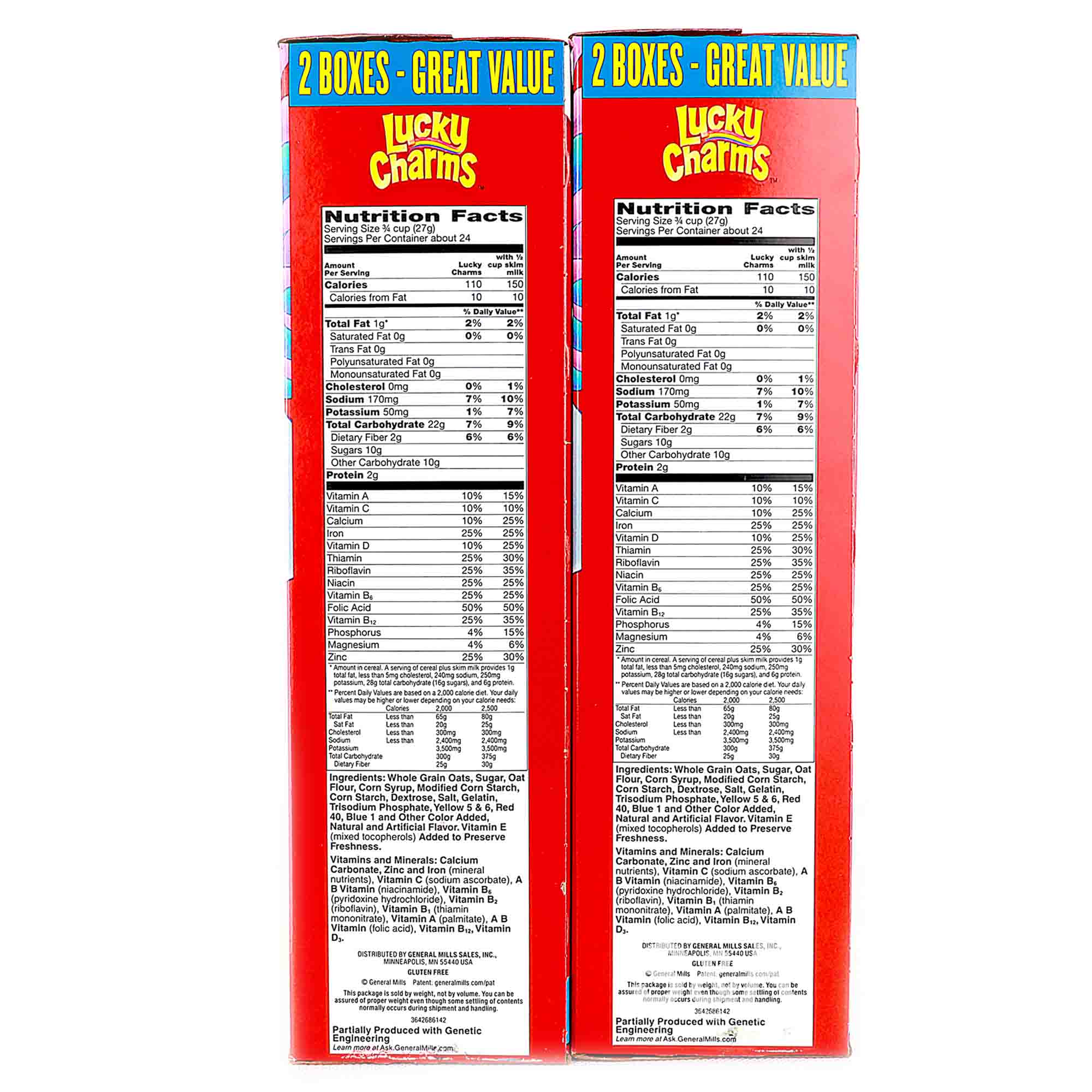 Lucky Charms Cereal Nutrition Label - This Nutrition Published on: 10/01/2021 | Last Updated: 20/05/2022. Learn more information about lucky charms cereal nutrition label. In this article we'll discuss lucky charms cereal nutrition label. This is not entire article. Lucky Charms Cereal nutrition, glycemic index, calories, net carbs & more Important nutritional characteristics for Lucky Charms Cereal Calories 380 Net Carbs ⓘ Net Carbs = Total Carbohydrates - Fiber - Sugar Alcohols 75.89 grams Acidity (Based on PRAL) ⓘ PRAL (Potential renal acid load) is calculated using a formula. On the PRAL scale the higher the positive value, the more is the acidifying effect on the body. Breakfast Pack Cereal - 9.14oz - General Mills : Target With General Mills Breakfast Cereal Multipack, every member of your family can find a bowl of cereal to enjoy. The cereal variety pack includes eight family favorites in convenient pouches: Lucky Charms, Cinnamon Toast Crunch, Cocoa Puffs, Cheerios, Honey Nut Cheerios, Golden Grahams, Frosted Cheerios and Trix. These individual cereal pouches ...