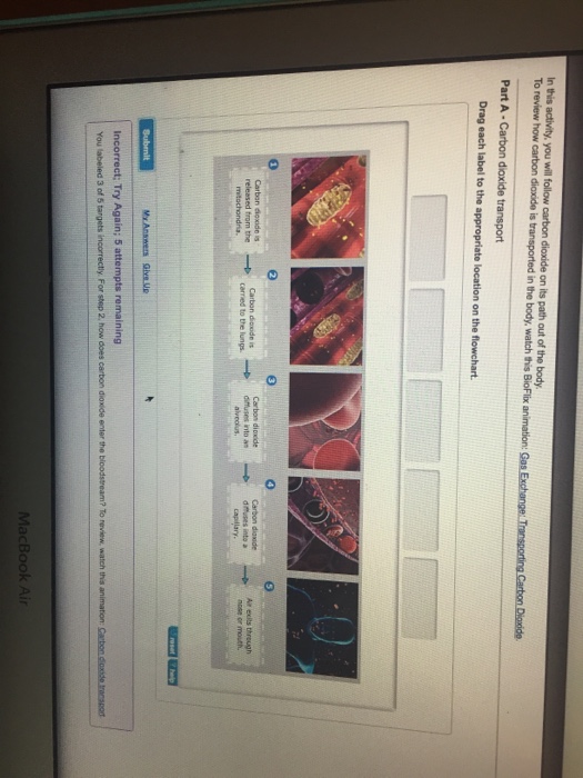 CH-13.pdf - Chapter 13 Homework Due: 11:59pm on Thursday,... Part A - Key events in gas exchange Drag each label to the appropriate location on the flowchart. ANSWER: Help Reset Carbon dioxide is released from the mitochondria. Carbon dioxide diffuses into a capillary. Carbon dioxide is carried to the lungs. Carbon dioxide diffuses into an alveolus. Air exits through nose or mouth.
