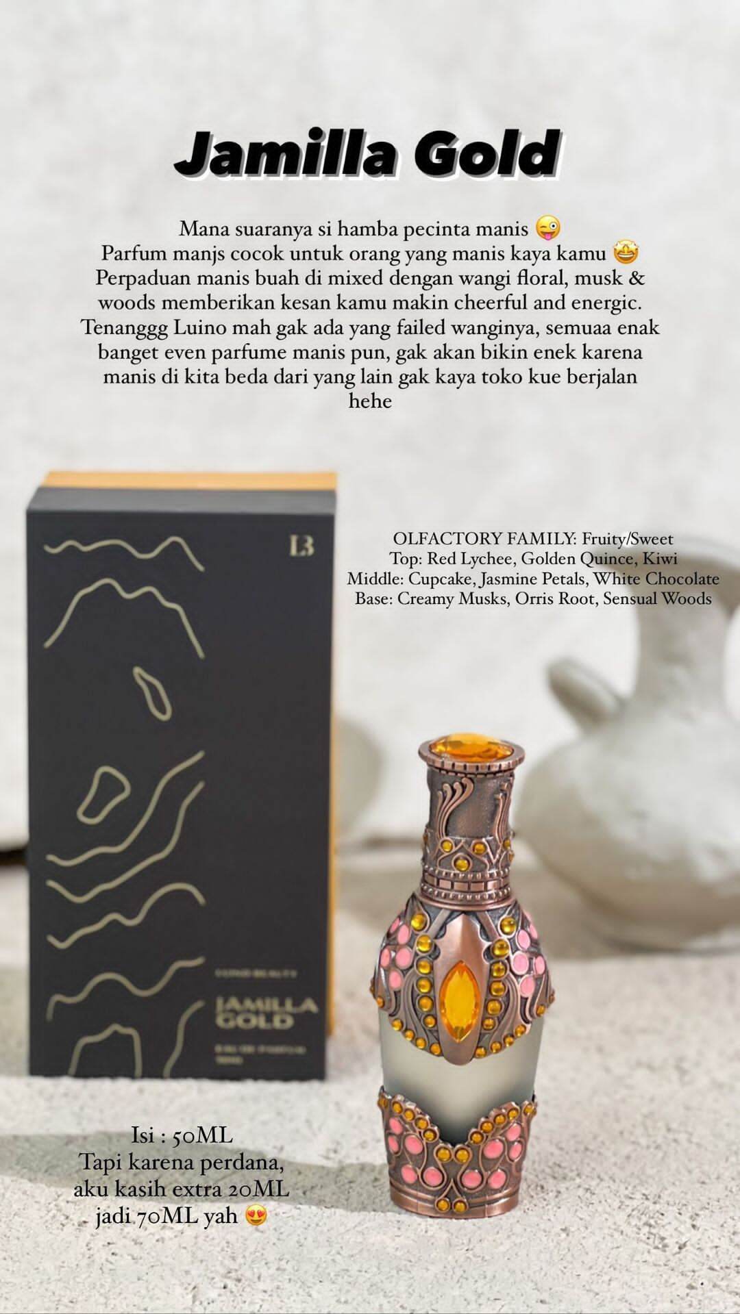 Jamila Swiss Arabian perfume - a fragrance for women Jamila by Swiss Arabian is a Amber Floral fragrance for women. Top notes are Apple and Marmalade; middle notes are Vanilla orchid, Magnolia, Jasmine and Rose; base notes are Musk, Amber, ebony tree and Sandalwood. "The purest form of beauty. Jamila is a representation of the most unadulterated, emotionally evoking idea of beauty in perfume form.