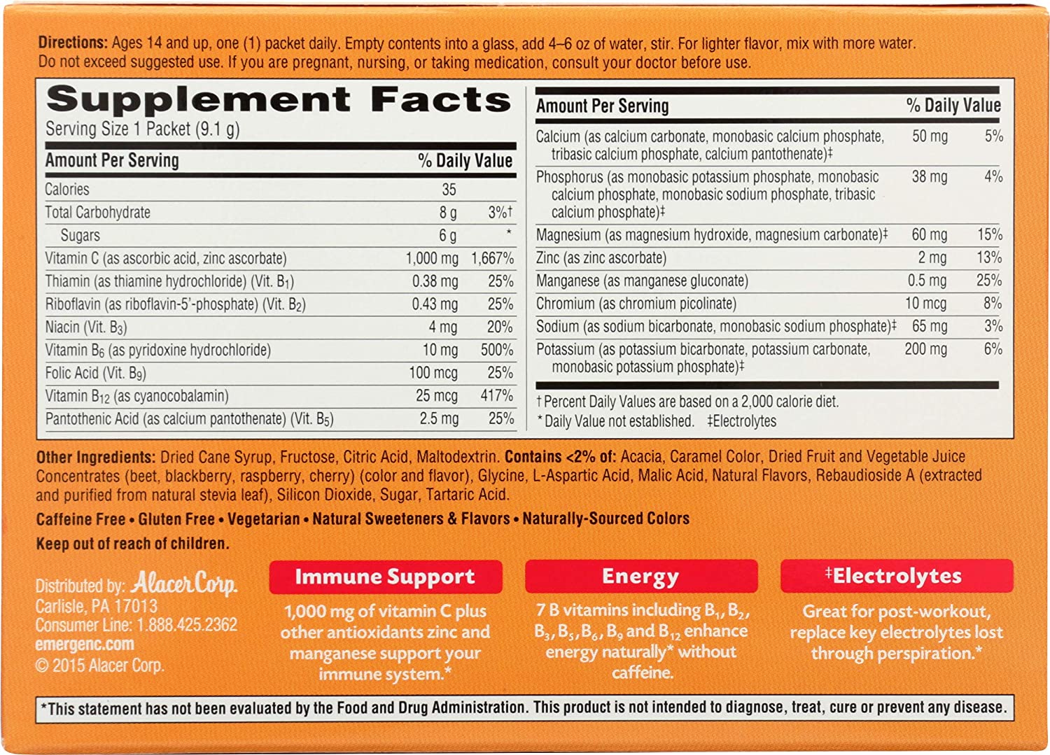 Amazon.com: Emergen-C 1000mg Vitamin C Powder for Daily Immune Support ... This item: Emergen-C 1000mg Vitamin C Powder for Daily Immune Support Caffeine Free Vitamin C Supplements with Zinc and Manganese, B Vitamins and Electrolytes, Super Orange Flavor - 30 Count $9.99 ($0.33/Count) Theraflu Multi-Symptom Severe Cold and Theraflu Nighttime Severe Cold and Cough Hot Liquid Powder Combo Pack 12 count Box Amazon.com: emergen- c 1-48 of 436 results for "emergen- c" RESULTS Emergen-C 1000mg Vitamin C Powder for Daily Immune Support Caffeine Free Vitamin C Supplements with Zinc and Manganese, B Vitamins and Electrolytes, Super Orange Flavor - 60 Count/2 Month Supply 0.32 Ounce (Pack of 60) 27,718 $1767 ($0.92/Ounce)$18.99 $16.79 with Subscribe & Save discount