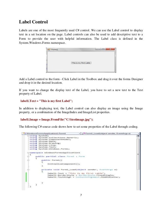 How to set Text on the Label in C#? - GeeksforGeeks In Windows Forms, Label control is used to display text on the form and it does not take part in user input or in mouse or keyboard events. You are allowed to set the text in the Label control using the Text Property. It makes your label more attractive. You can set this property using two different methods: 1. C# label control, with winforms label transparent background, multiline ... III, How to display multiline text in a label control c# If you put Label control directly into the Form, it will not wrap automatically, but if you put it in Panel, as long as its AutoSize property is set to False, it will wrap automatically; the method is: 1. Click "Toolbox" on the left side of the window.