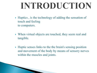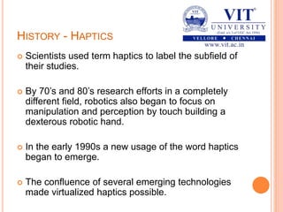 The term haptics is used to label the study of space. Haptic Technology ppt - SlideShare Aug 2, 2012 ... Scientists used term haptics to label the subfield of their studies that addressed human touch ... Combination Of : Tactile Information ... Towards a Design Space of Haptics in Everyday Virtual Reality ... The human haptic system consists of sensory, motor, mechanical, and cognitive components. For the scope of this study, we give a brief overview of tactile ... Chapter 5: Nonverbal Communication - Geneseo Proxemics is the study of communication through space. Space as communication was heavily studied by Edward T. Hall, 18 and he famously categorized space into four “distances. These distances represent how space is used and by whom (Figure 5.4). Figure 5.4 Edward T. Hall’s Four Spaces Ch. 5-7 Flashcards - Quizlet