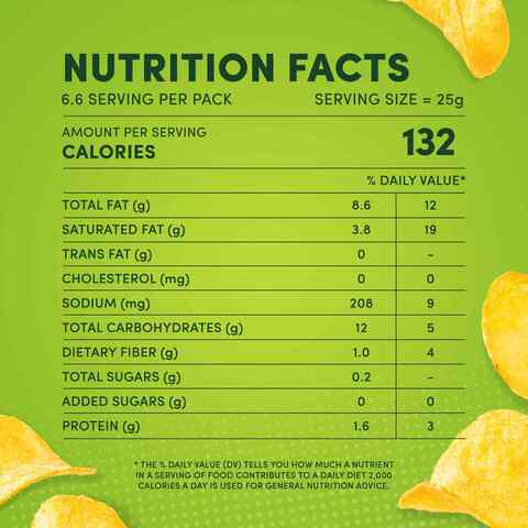 Nutrition Facts for Lay's Salt & Vinegar Potato Chips Lay's Salt & Vinegar Potato Chips Nutrition Facts Serving Size chips 17 chips = 28g Amount Per Serving 150 Calories % Daily Value* 15% Total Fat 10g 8% Saturated Fat 1.5g Trans Fat 0g 0% Cholesterol 0mg 10% Sodium 220mg 5% Total Carbohydrate 15g 4% Dietary Fiber 1g Total Sugars 0.5g 0% Includes 0g Added Sugars Protein 2g 0% Vitamin D 0mcg