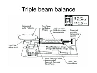 Triple Beam Balance: Purpose, Parts & Use - Study.com Triple beam balances are a type of lab equipment. The purpose of the balance is to measure the mass (how much stuff is inside something) of an object that is placed on the pan (flat stainless...