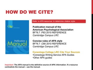 Library Services: APA @ Conestoga: Basic Citation Formulas Basic Citation Formulas - APA @ Conestoga - Library Services at Conestoga College Library Home APA @ Conestoga - Home Basic Citation Formulas Citations in Text Basic Citation Formulas Introduction to Citation Citation Elements Table 1 Citation Elements Note. Adapted from American Psychological Association, 2020, p. 262. Sample Paper - APA @ Conestoga - Library Services at ... APA @ Conestoga: The Basics Differences between original and updated APA @ Conestoga Annotated Bibliography Paper Template Sample Paper PowerPoint Template Nursing Resources Tracking Sources & Research Review Table Resources and Templates Sample Paper