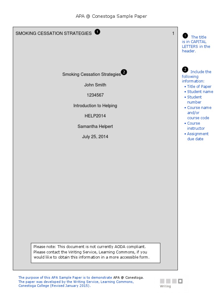 Apa conestoga. Library Services: Writing @ Conestoga: APA @ Conestoga APA was created by the American Psychological Association and currently follows 7th edition. It is used in most programs at Conestoga, and is traditionally used in disciplines such as psychology, sociology, business, and nursing. For more information, visit APA @ Conestoga. Check Your Knowledge of APA@Conestoga Library Services: APA @ Conestoga: References Format APA @ Conestoga - Home References Format Title Page Table of Contents Paper Format References Format Each reference must have a hanging indent. For more information on formatting hanging indents using MS Word, visit our Resources & Templates section. Example Becona, E., & Miguez, C. (2008). Group behavior therapy for smoking cessation. Library Services: APA @ Conestoga: General Information Each reference has a standard format that contains at least four pieces of information: author, year, title, and. source. In APA @ Conestoga, each piece is separated by punctuation. Depending on the type of source, more information may be required. Font - APA @ Conestoga - Library Services at Conestoga College APA @ Conestoga - Home Font Paper Format Font The paper must have a consistent font size and format. It must be double spaced. Some examples of acceptable fonts include, but are not limited to: Sans serif fonts like 12 pt. Arial 11pt. Calibri 10 pt. Lucida Sans Unicode Serif fonts like 12 pt. Times New Roman 11 pt. Georgia 10 pt. Computer Modern