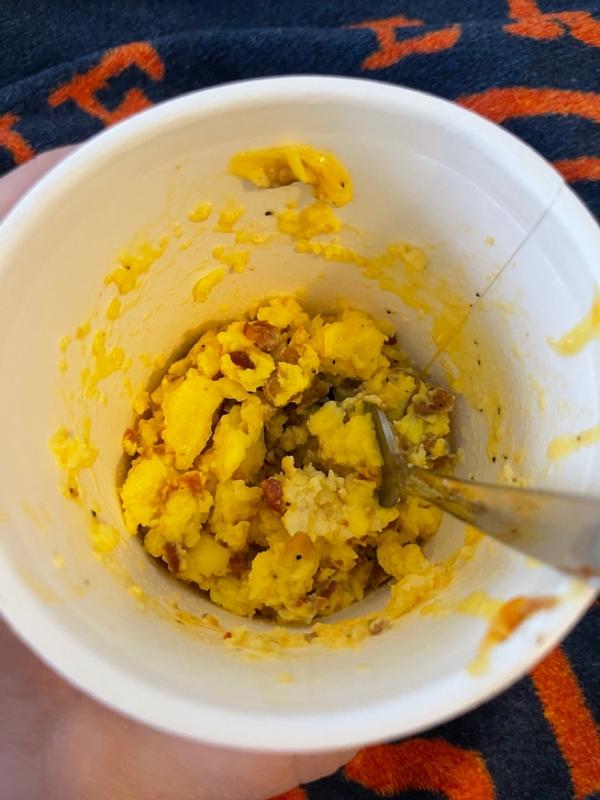 Breakfast Cup: Meat Lovers Simple Scrambles - Jimmy Dean 1. Remove film completely from cup and remove contents; pour eggs into cup. 2. Microwave on HIGH for 45 seconds. CAUTION CUP AND EGGS WILL BE HOT. 3. Stir in contents of pouch. Microwave for an additional 30-40 seconds until eggs are cooked. Let stand in microwave for 1 minute. CAUTION CUP AND EGGS WILL BE HOT. Enjoy! SIMPLE SCRAMBLES COOKING TIPS