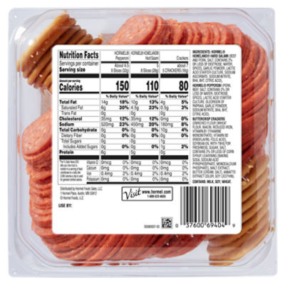 Hormel Nutrition Facts. Calories, carbs, fat, sodium & more • MyFoodDiary® Get nutrition information for Hormel items and over 200,000 other foods (including over 3,500 brands). Track calories, carbs, fat, sodium, sugar & 14 other nutrients. ... Hormel Turkey Pepperoni Snack Bites. 1 container (28g) Nutrition Facts. 70 calories. Log food: Hormel Original Pork Roast Always tender. 4 oz. Nutrition Facts. 160 calories.