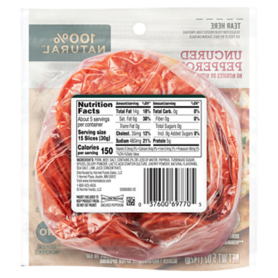 Nutrition Facts for Hormel Turkey Pepperoni • MyFoodDiary® Nutrition Facts. Serving Size. slices. 17 slices = 30g. Amount Per Serving. 70. ... Hormel Original Pepperoni. 15 slices (28g) Log food: Hormel Real Bacon ... 4 slices (56g) Log food: Hormel Chili w/ Beans. 1 cup (247g) Log food: Hormel Oven Roasted Deli Turkey Natural choice meats. 4 slices (56g) Log food: Hormel Teriyaki Pork Tenderloin ...