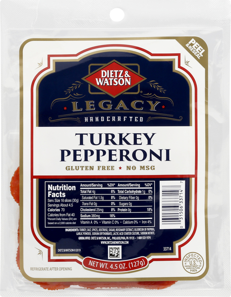 Hormel Turkey Pepperoni 5oz Bag - Garden Grocer Turkey pepperoni: 70 calories, 4g fat.Regular pepperoni: 140 calories, 13g fat per serving.Gluten free.Pillow Pack.1-800-523-4635.Visit .