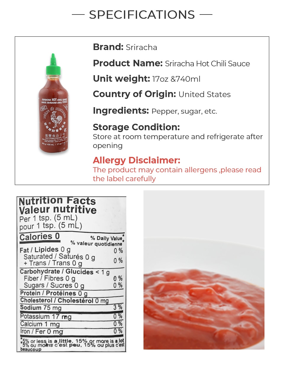 Sriracha: Nutrition, Benefits, Downsides - Healthline Dec 6, 2021 · Here’s the nutritional profile for a 1-teaspoon (5-gram) serving of Huy Fong’s classic sriracha sauce ( 1 ): Calories: less than 1 Carbs: 1 gram Protein: 0 grams Fat: 0 grams Fiber: 0 grams...