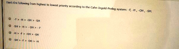 Rank the following sets of substituents in order of priority Rank substituents in order of their priority when assigning the E or Z label to an alkene. highest priority lowest priority Posted 2 months ago Q: Rank the substituents shown below in order of Cahn-Ingold-Prelog priorities (1 = highest priority group, 4 = lowest priority group).