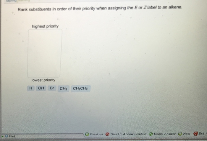 rank substituents in order of thier priorety when assigning the E... Q) Rank substituents in order of their priority when assigning the E or Z label to an alkene. CH2Br, CH3, H, Br, OH from lowest to highest? Ans) H < CH3 < CH3Br < OH < Br Priorities are given according to the atomic number of directly attached atoms, higher atomic number is given higher priority. In case if the first atom attached is same then the Solved > Rank substituents in order of their priority:922397 ... Question : Rank substituents in order of their priority when assigning the : 922397. Question : Rank substituents in order of their priority when assigning the : 922397. Rank substituents in order of their priority when assigning the E or Z label to an alkene. CH2CH2Cl, Br, H, Cl, CH2OH.
