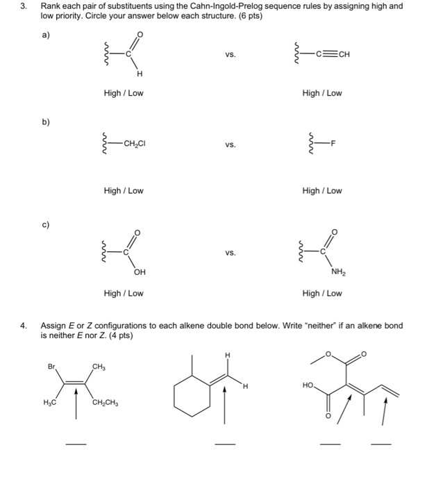 Rank the substituent in order of their priority when assigning the E or ... Rank the substituent in order of their priority when assigning the E or Z label to an alkene. Highest priority Lowest priority E, Z Notation for Geometric Isomers: This... Stereoisomers - Michigan State University Once the relative priorities of the two substituents on each of the double bond carbons has been determined, a cis orientation of the higher priority pair is designated Z, and a trans orientation is termed E.Applying these rules to the isomers of compounds A and B shown above, we assign the configuration of the 1-bromo-1-chloropropene isomer as E (Br has higher priority than Cl, and CH 3 a ... Organic Chemistry 331 - Sapling Learning CH 5 - Quizlet Select the correct name for the following compound, including the correct (E) or (Z) designation where appropriate. Draw the structural formula of (3E,5Z)-5-ethyl-3,5-nonadiene. An alternative name for this compound is (3E,5Z)-5-ethylnona-3,5-diene, which follows the rules outlined in the 1993 IUPAC recommendations. Solved Rank substituents in order of their priority when ... Rank substituents in order of their priority when assigning the E or Z label to an alkene. - Br - Cl - CH3 - CH2Br - H This problem has been solved! You'll get a detailed solution from a subject matter expert that helps you learn core concepts. See Answer