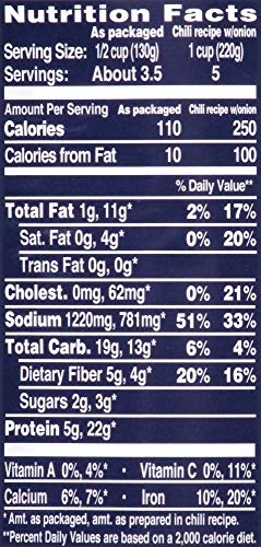 Bush's chili beans nutrition label. Bush's Best Chili Beans Pinto Beans, Mild Chili Sauce - Fooducate Nutrition · Serving Size: 1/2 cup (130g) · Amount per Serving My Daily Value · Calories 110Kcal 6% · Total Fat 0.5g 1% · Saturated Fat 0g 0% · Trans Fat 0g 0%. Bush's Best Chili Beans, Pinto Beans in Chili Sauce, canned Nutrition Facts ; 6 g · 40 mg · 400 mg. Bush's Best Chili Beans Red Beans in Chili Sauce Mild - Giant Food Prepared Red Beans, Water, Contains 2% Or Less Of: Tomato Puree (Tomato Paste, Water), Modified Corn Starch, Salt, Spice, Corn Oil, Garlic Powder, ... Calories in Bush's Best Chili Beans in Mild Sauce and Nutrition Facts Dec 18, 2014 ... There are 110 calories in 1/2 cup (130 g) of Bush's Best Chili Beans in Mild Sauce. Nutrition Facts. Serving Size, 1/2 cup (130 g) ...
