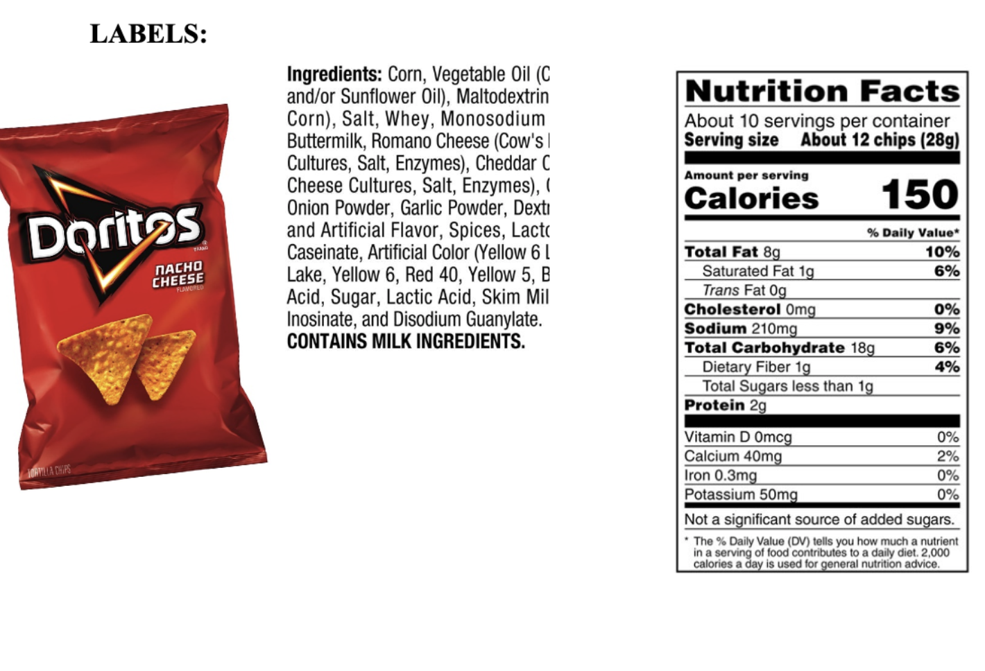 Doritos Label - This Nutrition Doritos Label. Last Updated: August 08, 2022. Learn more information about doritos label. In this article we'll discuss doritos label. What You Need To Know About Labels. Do Food Labels Lead To The Desired Choice? "Traffic Light" On The Labels Will Warn Of Harmful Foods. Lays Potato Chips Nutrition Label. DORITOS® Mix Variety Pack | Variety Packs DORITOS®Nacho Cheese Flavored Tortilla Chips The % Daily Value (DV) tells you how much a nutrient in a serving of food contributes to a daily diet. 2,000 calories a day is used for general nutrition advice. All products are labeled accurately with the most current ingredient information. DORITOS® COOL RANCH® Flavored Tortilla Chips DORITOS® COOL RANCH® Flavored Tortilla Chips Nutrition Facts Ingredients Product Reviews Related Products DORITOS® TAPATIO® Flavored Tortilla Chips view product DORITOS® Nacho Cheese Flavored Tortilla Chips 10 Multi-Pack view product DORITOS® Mix Variety Pack view product DORITOS® Spicy Nacho Flavored Dip view product NEW! Calories in Doritos Calories, fat, protein, and carbohydrate values for for Doritos and other related foods. Toggle navigation Toggle search bar. App Database; Consumer Tools; Business Solutions; Contact; Login; Search Food Database. ... Nutrition Facts. Serving Size: oz (28 g grams) Doritos Amount Per Serving. Calories 147 % Daily Value*