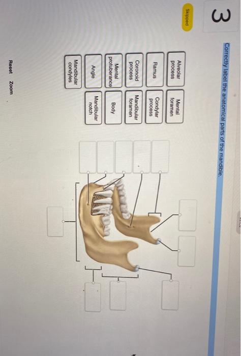 Chapter 8 Axial/Appendicular QS Anatomy Flashcards | Quizlet Correctly label the following anatomical parts of the mandible. Coronoid Process, Mandibular notch, Condylar process, ramus, mendibular foramen, mental foramen Match the following named structures in the femur with other structures with which they articulate. Patella=Patellar intercondylar surface of femur Tibia and fibula=Lateral epicondyle Mandible - Wikipedia In anatomy, the mandible, lower jaw or jawbone is the largest, strongest and lowest bone in the human facial skeleton. It forms the lower jaw and holds the lower teeth in place. The mandible sits beneath the maxilla.It is the only movable bone of the skull (discounting the ossicles of the middle ear). It is connected to the temporal bones by the temporomandibular joints. The mandible: Anatomy, structure, function | Kenhub The mandible consists of two main parts: a body and two rami. These parts feature various anatomical landmarks participate in important functions of the mandible, for example housing the teeth and providing the passage for neurovascular structures. This article will discuss the anatomy of the mandible. Contents Anatomy Body Ramus Solved Correctly label the anatomical parts of the mandible ... - Chegg Correctly label the anatomical parts of the mandible. 3 Skipped Alveolar process Mental foramen Ramus Condylar process Coronoid process Mandibular foramen Mental protuberanco Body Angle Mandibular notch Mandibular condyles Reset Zoom This problem has been solved!